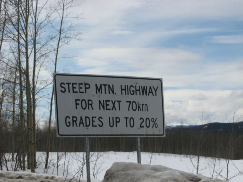 But the typical bit ended abruptly with a sign that said - beware road has steep grades of up to 20%. And sure enough not long after we found ourselves creeping down a series of steep (18% grade the sign said) gravel switch backs to a bridge over the Tuya River. Not long after we were presented with another series of switch backs this time the grade was 20% down into the valley of the Stikine River.
