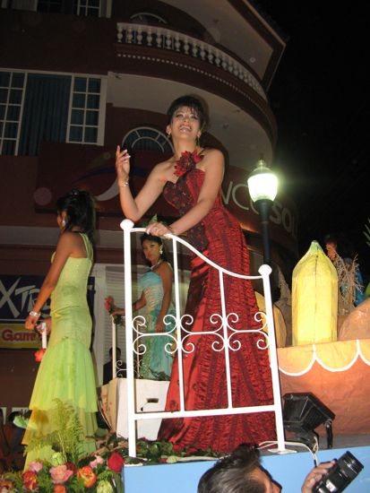 As the schedule 7:00 pm start approached we found a vantage point and waited for the fun to start. My words cannot do justice to the the parade and associated antics of the crowd. We left about 10:00 pm but apparently the parade went on until after midnight. That should give you some idea of the number of people in the parade. There were floats carrying candidates for Queen of the festival, there were a number of bands, various community groups from local and distant communities, and there were local Indian groups performing (what we assumed were traditional) dances. To my mind the best summary of the parade was the lady carrying a pole to which had been tied a number of live and dead chickens.