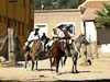 About 10:30 we walked the short distance to the main square and waited around listening to the interminable speeches with the rest of the crowd and sampling some of the empanadas on sale everywhere. The parade eventually got underway and for a number of hours we were treated to numerous local school groups "marching" past the square. It was more than a little surprising to see how many schools and children there were in this region. The parents of the marching children were like parents everywhere - with their cameras out they raced along beside their darlings trying to get a few thousand snaps to remember the day. We found the crowd at least as interesting as the marchers. Kids stuffing themselves with ice cream, parents trying to keep bored younger children amused, men dressed in gaucho walking around (with knives in their belts) greeting each other with kisses and chatting, and everywhere food vendors. In a way the scene was both exotic, but strangely familiar - for all the differences not unlike a parade in any country town. Eventually the sun got to be too much for us and we headed back to the campground for some relief. It was only once back at the campground we got to see the gauchos in any numbers. Many of them were meeting at the campground after the parade for a barbecue. So we got to see many men in balloon pants, and ladies in bright blue dresses riding on their ponies. They gave displays of their riding prowess whilst riding their animals around the campground.