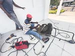 For me the highlight of the day was a visit to Maputo's Cathedral. Not because I have an interest in religious buildings but because of the two gardeners I met on the front steps of the building. They had obviously been cutting the lawns that surroound the Cathedral when the front axle of their mower broke away from the mower frame. When I found them they were sitting on the steps patching the mower back together with a small welder. Notice all the safety equipment they are wearing,... NOT.