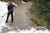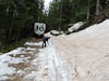 Our plan for the day was an ascent into the La Sal Mountains on the east of Moab. These are in contrast to the red rock of Moab, The Arches and Canyonland. The La Sals which range up to over 12,000 ft are green and covered in pine and aspen. Our route took us south east of Moab and up a steep forest road with some impressive switchbacks. At about 9,000 ft we passed a car containing two WA tourists who were turning back as the road was too rocky for their hire car. We (unfortunately) continued. It was not long before we were passing small mounds of snow laying across the uphill edge of the road. This is a sign that you would think we would now know and take heed but no, we continued. After passing one particularly narrow section where we were squeezed between the snow on the uphill side and a steep drop and soft edge on the downhill side we came to a bank of snow completely covering the road. Progress was stopped. So we turned out attention to retracing our path. That is reversing as there was no possible chance of turning around. Our first attempt to reverse over the previously mentioned narrow section only succeeded in starting to collapse the downhill side of the trail. A new approach was called for - digging.